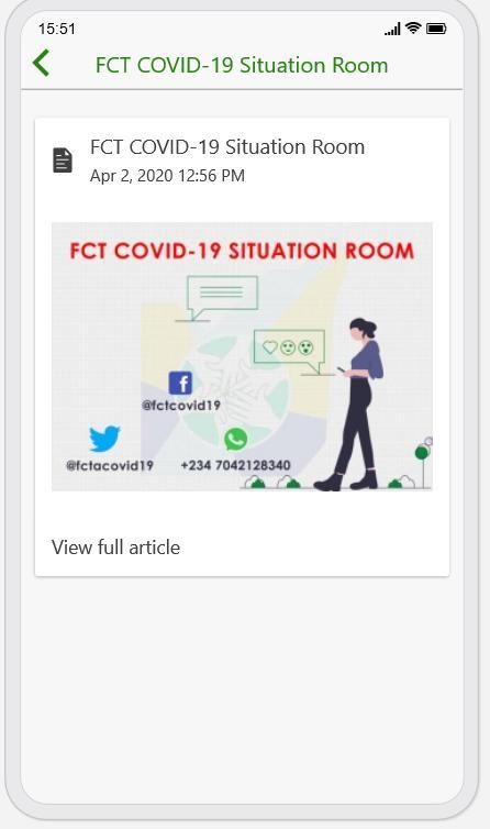 एफसीटी रिस्पांस मोबाइल ऐप संघीय राजधानी क्षेत्र, अबूजा, नाइजीरिया आधिकारिक प्रतिक्रिया और सूचना हब है। FCT Response Mobile App को संघीय राजधानी क्षेत्र अबूजा और संघीय राजधानी क्षेत्र की सरकार के निवासियों के बीच संचार को आसान बनाने के लिए विकसित किया गया था। यह ऐप एक्सेस से लेकर इमरजेंसी नंबर और एड्रेस, लेटेस्ट न्यूज अपडेट, प्रेस रिलीज, नोटिफिकेशन और अनाउंसमेंट, सर्वे और ओपिनियन पोल, अक्सर पूछे जाने वाले सवाल, सोशल मीडिया कॉन्टेक्ट जैसे फेसबुक और ट्विटर आदि से बना है।