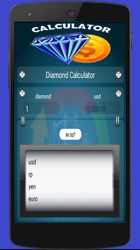 केल बटन दबाएं और आपको डायमंड की कीमत मिले। और आप हीरे की कीमत मुद्रा, आरपी, यूरो, येन, रिंगित और आदि में देख सकते हैं।
