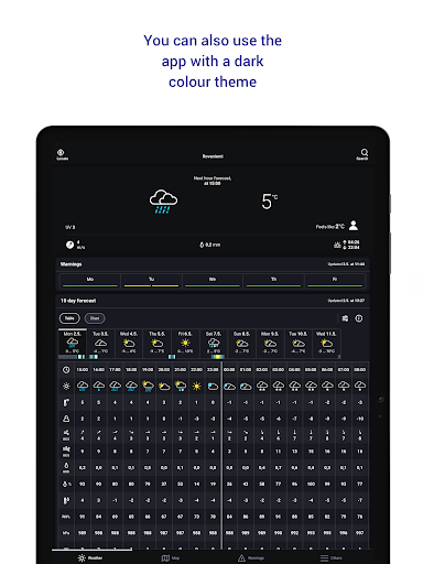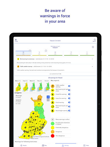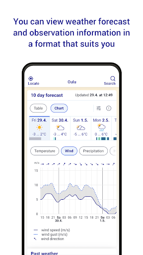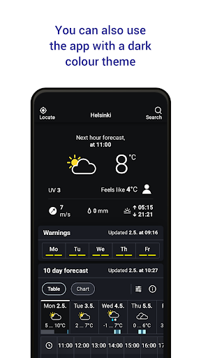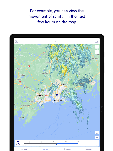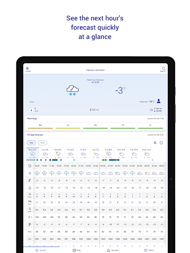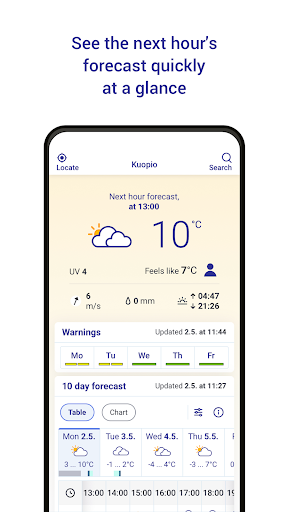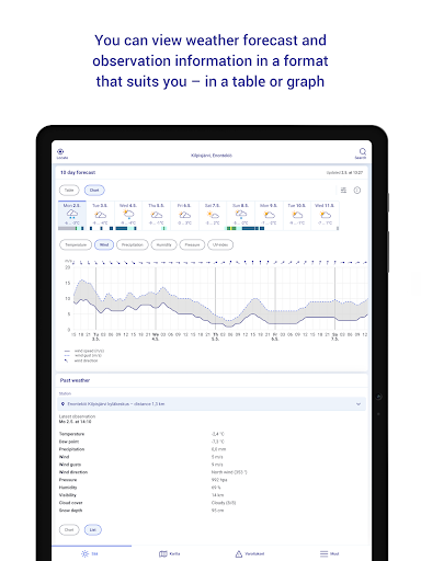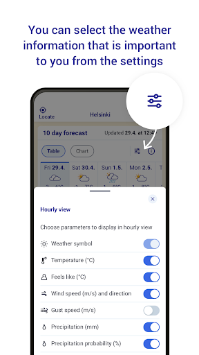 हमारा मौसम ऐप लगभग सभी फिनिश नगरपालिकाओं के लिए मौसम की जानकारी प्रदान करता है।यदि आप अपने फोन पर स्थान सक्षम करते हैं, तो सेवा स्वचालित रूप से 10 दिनों तक आपके स्थान का पूर्वानुमान दिखाएगी।क्या आप केवल तापमान में रुचि रखते हैं या आप दबाव, पवन गस्ट या यूवी इंडेक्स के बारे में भी जानकारी चाहते हैं?मौसम के पूर्वानुमान और मौसम अवलोकन दोनों आपको यह चुनने की अनुमति देते हैं कि आप किस मौसम के डेटा को देखना चाहते हैं।आप ऐप पर फिनलैंड और विदेश में अपने पसंदीदा स्थानों को भी बचा सकते हैं और उन्हें आसानी से ब्राउज़ कर सकते हैं।जानकारी टेबल और ग्राफ़ के रूप में उपलब्ध है।मानचित्र अनुभाग में एनिमेशन आपको अनुसरण करने की अनुमति देते हैं, उदाहरण के लिए, वर्षा क्षेत्रों की आवाजाही, और रडार छवियों के आधार पर बारिश का पूर्वानुमान उस दिशा को दर्शाता है जिसमें आने वाले घंटों में वर्षा के क्षेत्र आगे बढ़ेंगे।सेवा आपके चुने हुए स्थान पर वर्तमान मौसम की चेतावनी प्रदर्शित करती है और आप पूरे फिनलैंड में आधिकारिक मौसम की चेतावनी भी आसानी से देख सकते हैं।