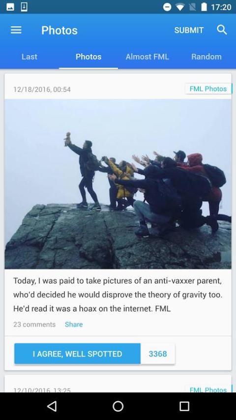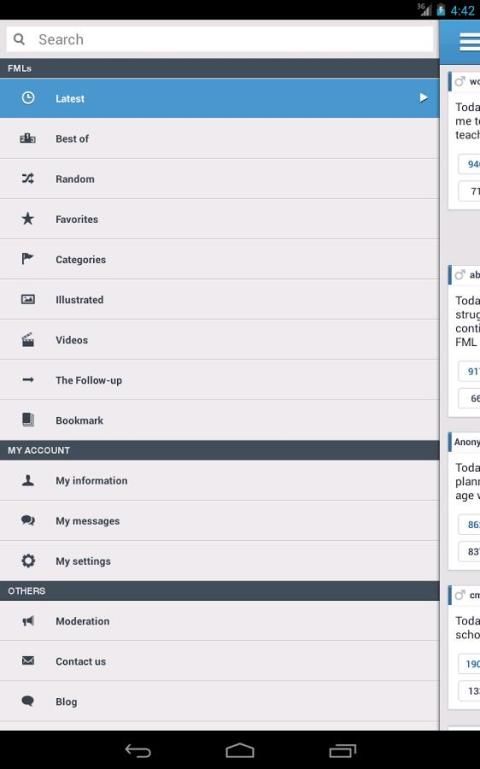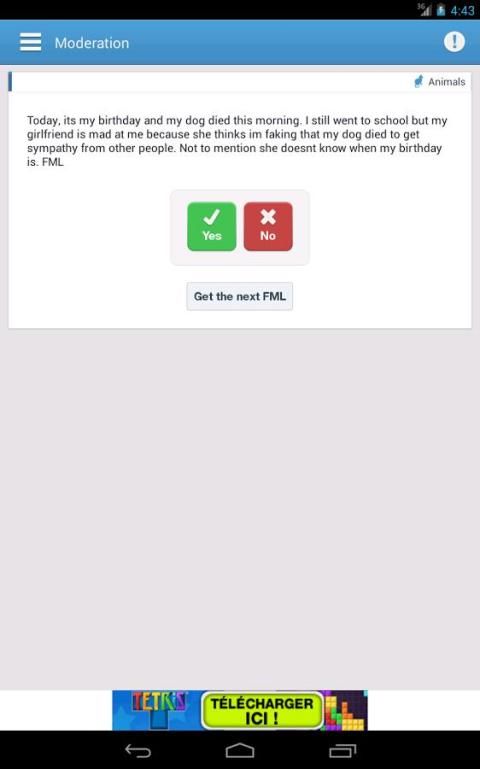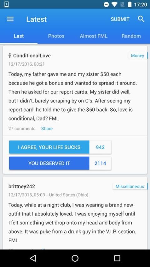 इस लोकप्रिय fmylife.com वेबसाइट है, जो एक दिन का embarrassments और बदकिस्मती की बेहतरीन स्लाइस प्रकाशित के लिए एक और केवल सरकारी अनुप्रयोग है. हौसले से अद्यतन कहानियों, हंसते हुए कहते हैं, cringes और भी जोड़ा सुविधाओं का लाभ लेने के लिए अपना खुद का मुफ्त सदस्य खाते बनाने के अपने दैनिक तय हो जाओ.