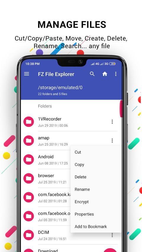 अपनी फ़ाइलों (फ़ाइल एक्सप्लोरर) को प्रबंधित करें, जैसे आप अपने डेस्कटॉप या लैपटॉप पर एकाधिक चयन, कट / कॉपी / पेस्ट, मूव, क्रिएट, डिलीट, रिनेम, सर्च, शेयर, सेंड, हाईड, क्रेटकट और बुकमार्क का उपयोग करके करते हैं;