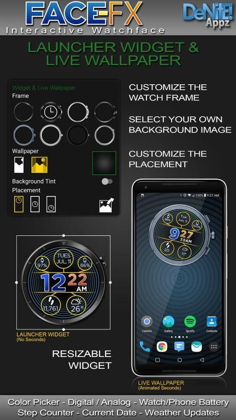 Watch Face, Clock Widget & Live Wallpaper brings a classic elegance to your wrist and Launcher. Features include custom complications, battery levels, weather conditions, step counter, color picker & date information. A settings app will also be installed on your mobile device to configure the watch face for any look you desire. Select any color and create a completely custom look for yourself! Don't have an Android Wear watch? No Problem! You can use the clock widget or Live Wallpaper on your launcher!