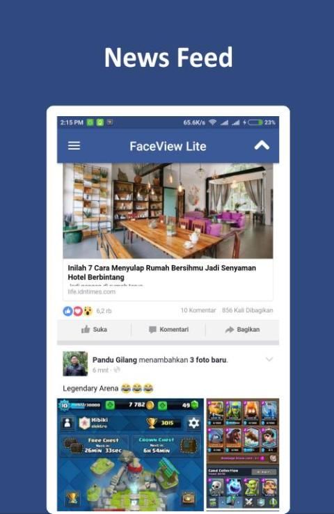 Following is the introduction of a wonderful App. 20,000+ users downloaded FaceView for Facebook Lite latest version on 9Apps for free every week! In my opinion, you will like this app after use it. This hot app was released on 2017-01-20. Download and play this free app for android mobile phone now!