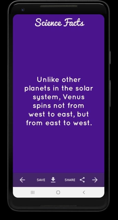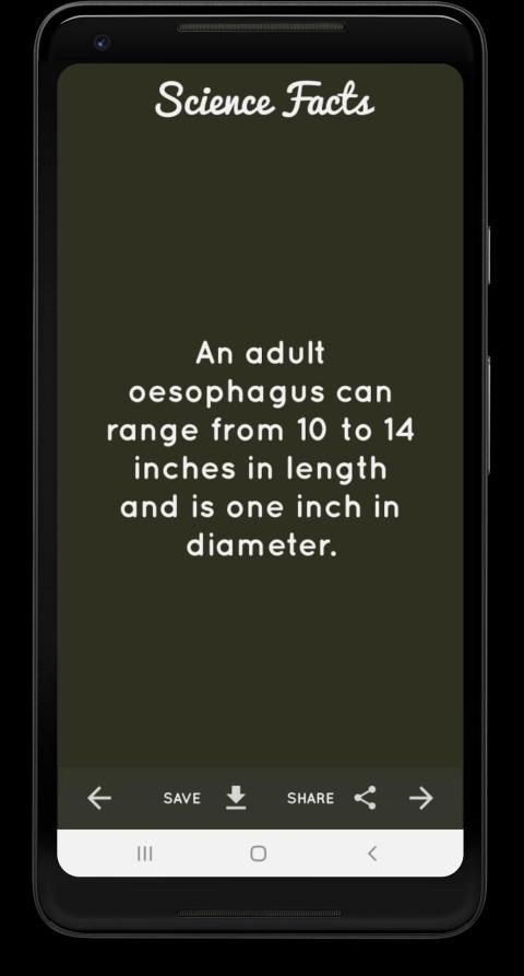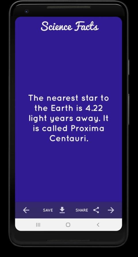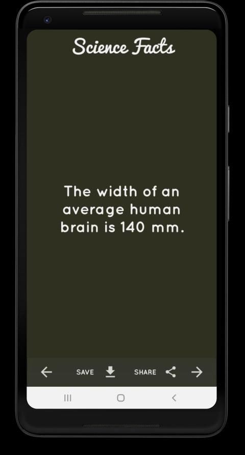 एक बार जब आप एप्लिकेशन डाउनलोड करते हैं तो आपको एक दिलचस्प विज्ञान तथ्य के साथ प्रस्तुत किया जाएगा। यदि आप इसे पसंद करते हैं, तो आप इसे अपने फोन पर एक छवि के रूप में सहेज सकते हैं। आप इसे अपने उन दोस्तों के साथ साझा कर सकते हैं जो विज्ञान से प्यार करते हैं या यहां तक कि आप इसे अपने माता या पिता के साथ अपने माता-पिता या अपनी दादी के साथ साझा कर सकते हैं, मैं वादा करता हूं कि वह इसे पसंद करेंगे।