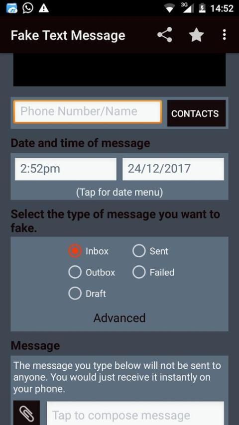 2) भेजा गया - नकली एसएमएस किसी को सफलतापूर्वक भेजा गया।