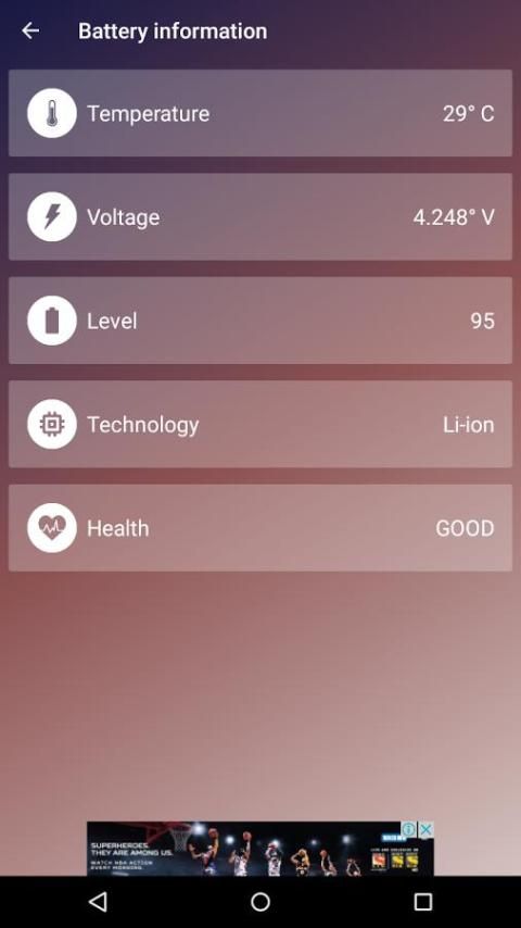 ✓ हमारी तेजी से चार्ज 5x अनुप्रयोग भी एप्लिकेशन के मुख्य स्क्रीन के भीतर विस्तृत बैटरी में जानकारी शामिल है। आप डिग्री सेल्सियस, बैटरी की वोल्टेज और अंत स्तर में बैटरी ऊर्जा के प्रतिशत के रूप में अच्छी तरह के रूप में तापमान देखने के लिए सक्षम हो जाएगा।
