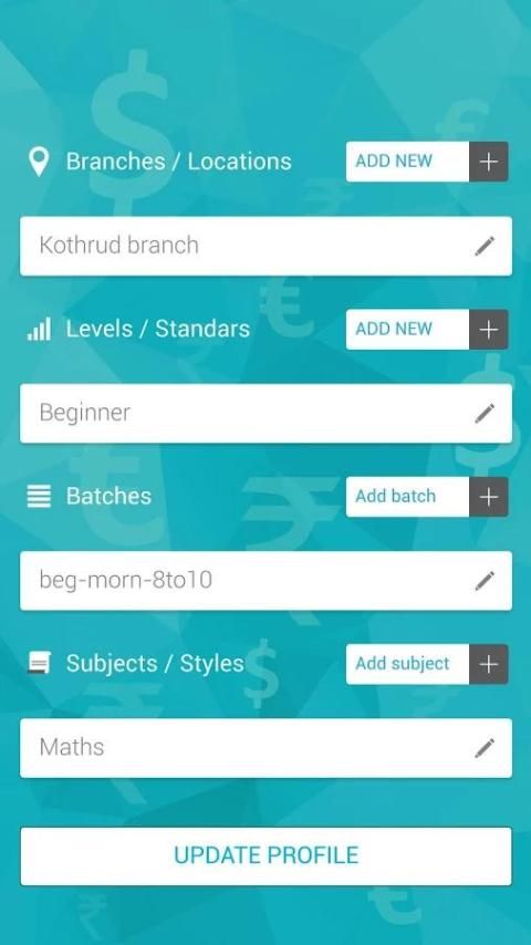 नृत्य, संगीत, शिक्षा - App उपयोगकर्ता किसी भी कोचिंग क्लास विन्यस्त करने के लिए अनुमति देता है। यह कई शाखाओं और विषयों का समर्थन करता है। उपयोगकर्ता प्रत्येक छात्र से एकत्र फीस ट्रैक कर सकते हैं। जबकि उपस्थिति लेने, लाल मार्कर एक छात्र है जो पूरे शुल्क का भुगतान नहीं किया गया है इसके अलावा प्रदर्शित किया जाता है।