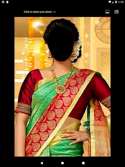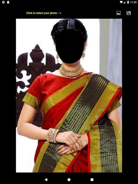 Select a Saree, select your photo from gallery, adjust your face and save. Done!