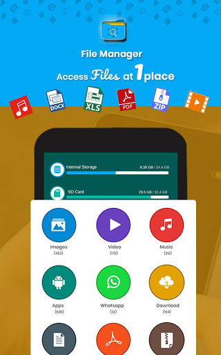 File Manager helps you handle all your all files whether they are stored on your device storage or SD card. View Images, Videos, Music, Apps, Doc, Compressed Files, Downloads, Internal & External Storage details on a single screen.