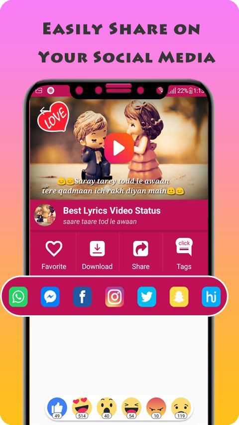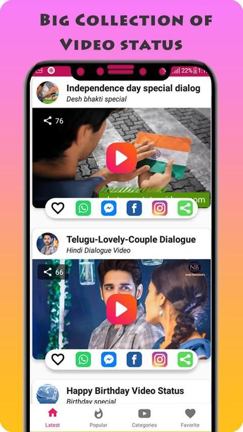 इस एप्लिकेशन को दोस्तों के साथ डाउनलोड करने और साझा करने और व्हाट्सएप में सेट करने के लिए नवीनतम और नई ऑनलाइन वीडियो स्थिति प्रदान करें।