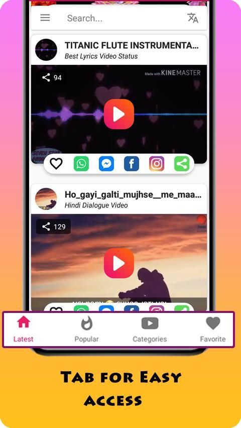 Smart Search : Search your favorite video status by just typing first few words and you will get suggested results.