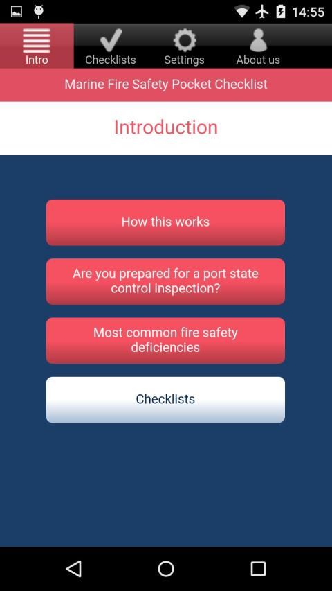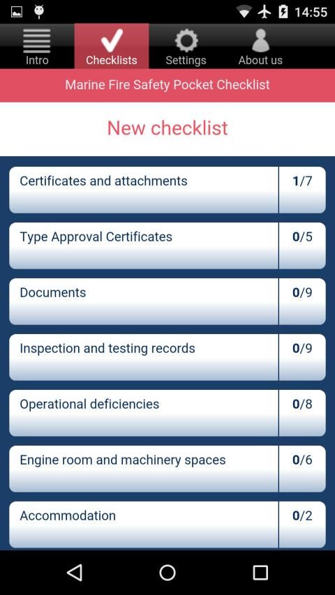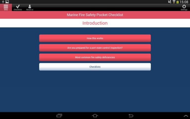 समुद्री फायर सेफ्टी पॉकेट चेकलिस्ट अंतरराष्ट्रीय सम्मेलन की आवश्यकताओं के अनुपालन के साथ जहाज सुनिश्चित करने में मदद करने के लिए की कमी सबसे अधिक पाया जाता है जहां 32 आइटम, 30 प्रमाण पत्र और बोर्ड पर किया जाना चाहिए कि दस्तावेजों और 15 उपयोगी टिप्स सूचीबद्ध करता है। व्यक्तिगत चालक दल के सदस्यों में वह या वह के प्रभार में है जहाज के क्षेत्र के लिए जिम्मेदारी लेने के लिए कर सकते हैं ताकि चेकलिस्ट आसानी से अलग जहाज क्षेत्र द्वारा आयोजित किया गया है।