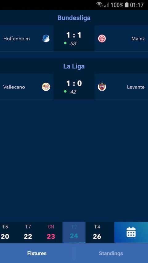 - फिक्स्चर, कई लीगों पर प्रकाश डाला गया: प्रीमियर लीग, बुंडेसलीगा, सीरी ए, लेट 1, लालिगा, चैंपियंस लीग, यूरोपा लीग,