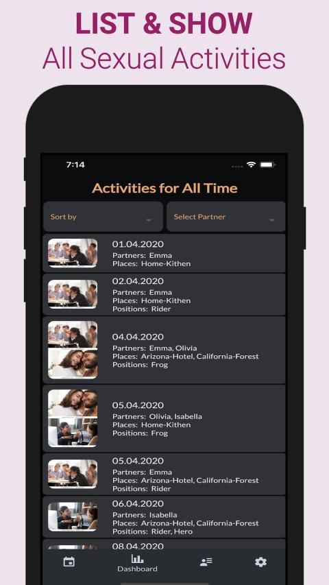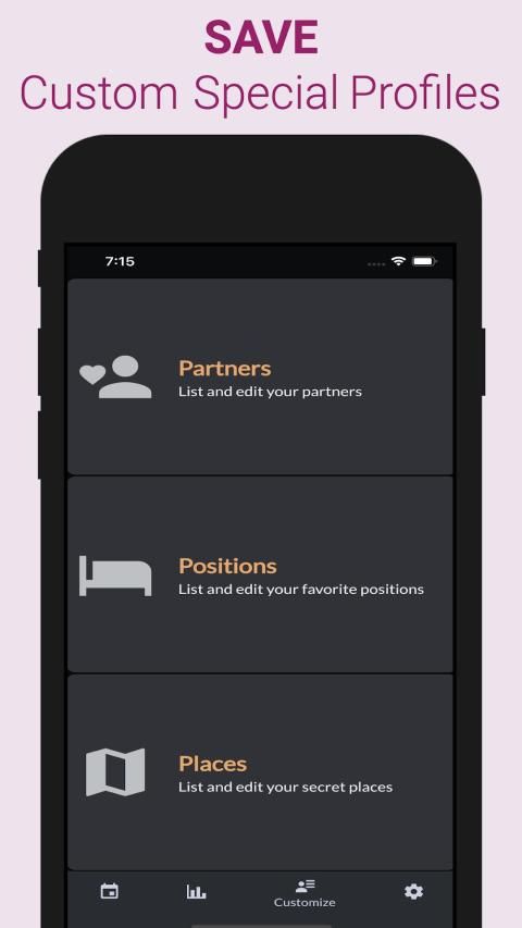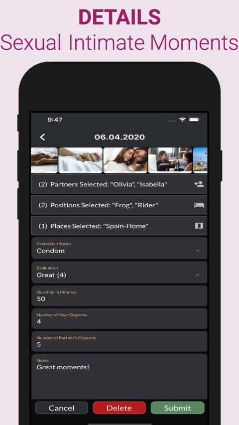 This sex tracker app lets you track sexual activities, sex life, sexual health, sexual intimacy and gives you sex statistics about your private life for better sexual wellness.
