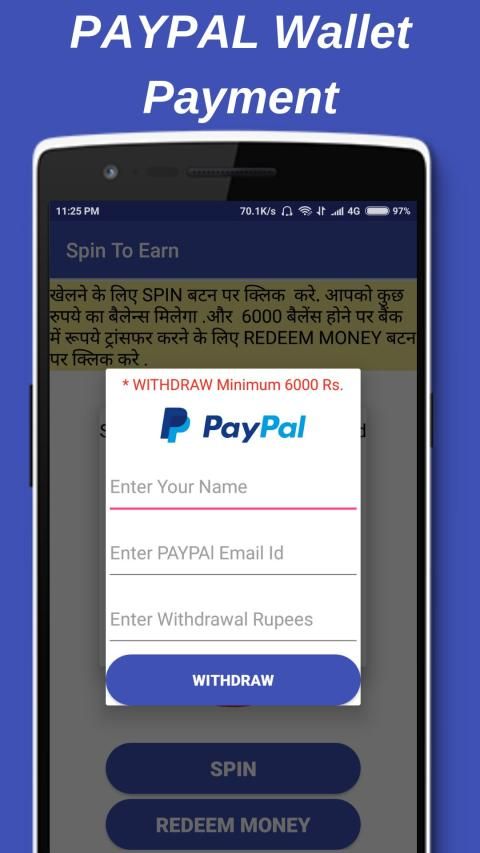 लकी ड्रा व्हील को स्पिन करने के लिए स्पिन बटन पर क्लिक करें। Afetr क्लिक करें आप किसी भी यादृच्छिक रुपए जीतते हैं, तो अधिक स्पिन करें और अधिक कमाएं।