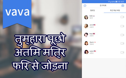 क्या आपने कभी बुरा अनुभव किया है, जब आप अपने पसंदीदा मित्र से मिलते समय कनेक्ट होने में असफल रहे? "VAVA" आपको अपने पसंदीदा मित्र को फिर से वीडियो चैट करने का अनुरोध भेजने के लिए समर्थन करता है।