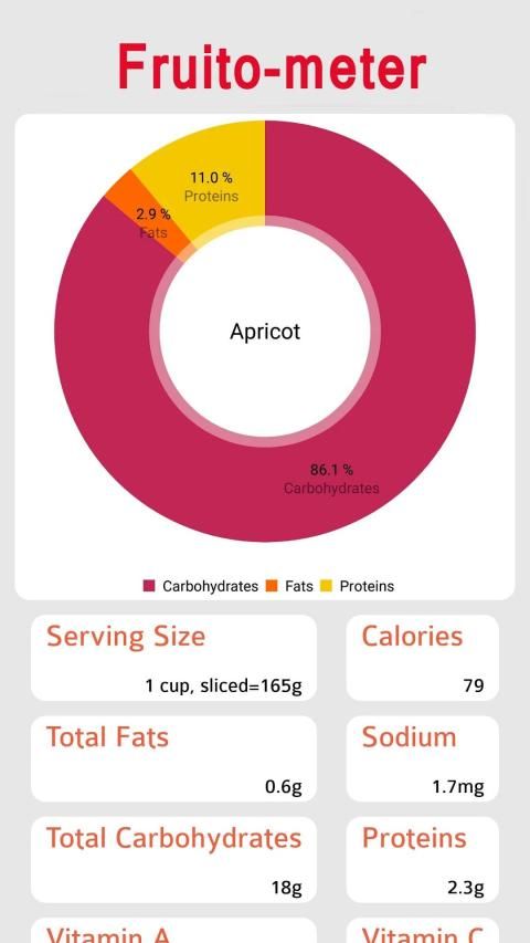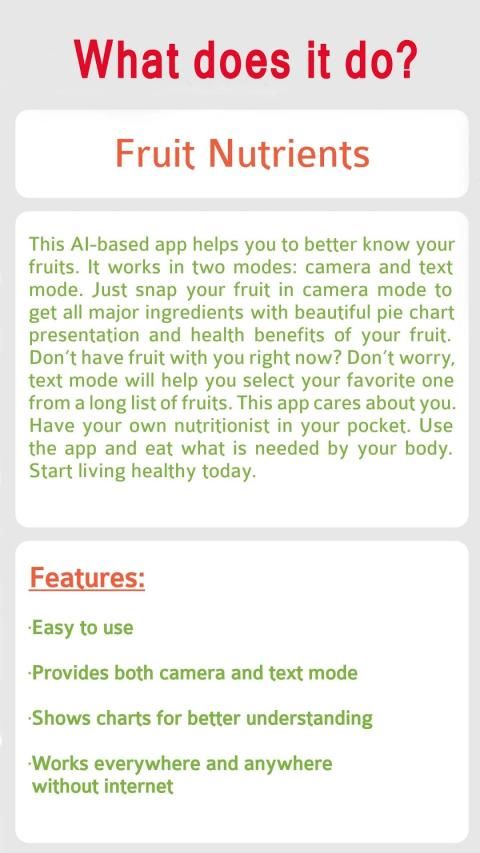 Just snap your fruit in camera mode to get all major ingredients with beautiful pie chart presentation and health benefits of your fruit.