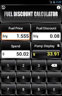 Lets say the fuel price is $1.555/L and you want to spend $50.02. If you have a discount of $0.08/L, Fuel Discount Calculator instantly works out that you need to pump the amount of $52.73 or 33.91L.