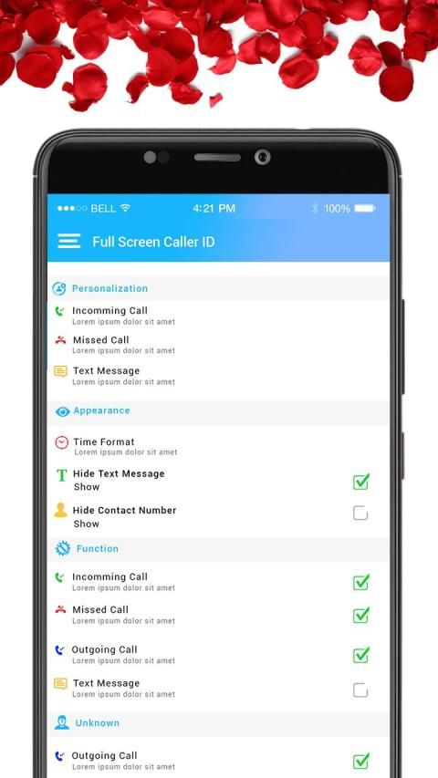 - सभी या केवल कुछ संपर्क के लिए पूर्ण स्क्रीन कॉलर आईडी चुनें।