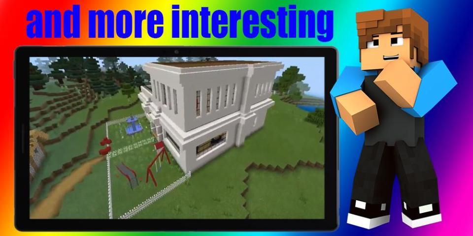-Living room: sofa, armchair, Christmas tree, slot machines (automatic machine with chewing gum, billiards, pack-man), paintings, fireplace, new TV, bedside table( not like in minecraft pe ), piano.