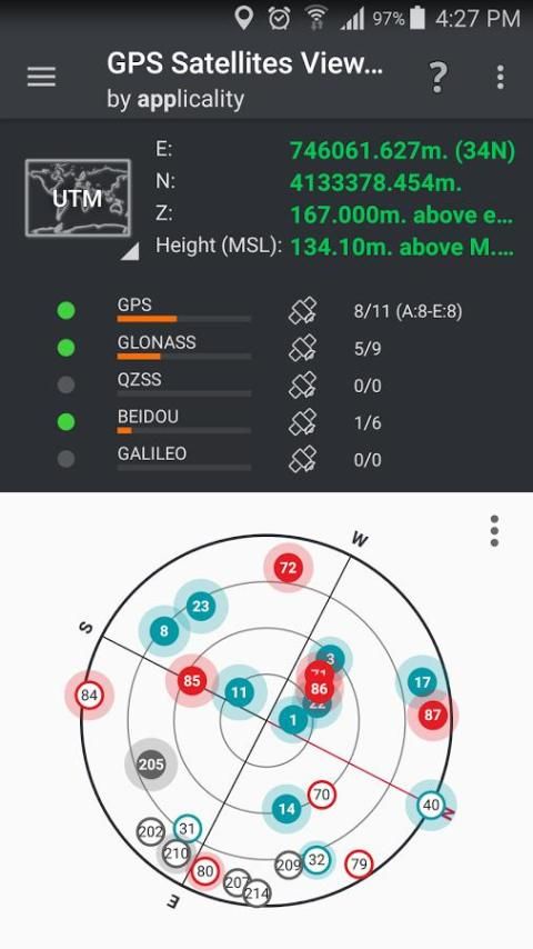 ... अपने डिवाइस के कैमरे का उपयोग वास्तविक आसमान पर परियोजना GNSS उपग्रहों। नक्षत्र, उपग्रह आईडी, फिक्स में इस्तेमाल किया, सिग्नल की शक्ति की जानकारी दिखाई दे रहे हैं।