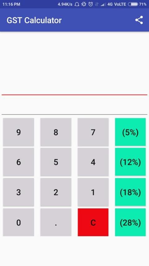 एक जीएसटी कैलक्यूलेटर एप्लिकेशन आप अपने बिल पर कुल जीएसटी की गणना करने में मदद मिलेगी, तो आप सिर्फ राशि दर्ज करें और जीएसटी का वह प्रतिशत चुनें करने के लिए है और वहाँ तुम जाओ, तुम शामिल जीएसटी के साथ कुल राशि मिल जाएगा।
