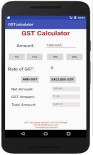 जीएसटी कैलक्यूलेटर जो आप अपनी उंगली युक्तियाँ पर सभी 4 जीएसटी कर की दरें गणना करने के लिए अनुमति देता है एक आसान एप्लिकेशन है। यह लेता है-में एक राशि (या तो सकल या शुद्ध) और आप जोड़ सकते हैं या निश्चित राशि से जीएसटी को कम करने की अनुमति देता है।