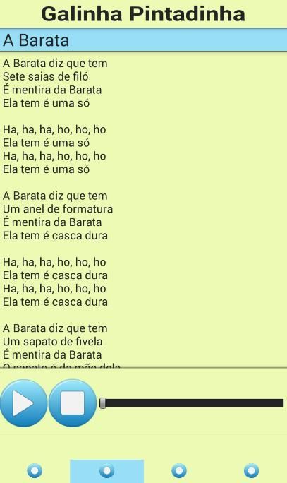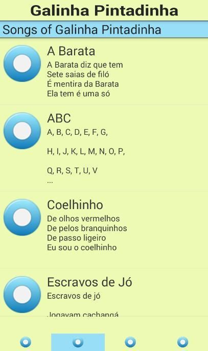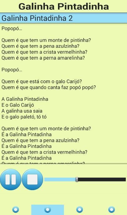 यह आवेदन अत्यधिक प्रशंसकों Pintadinha Galinha के लिए सिफारिश की है। यह सभी संगीत Galinha Pintadinha प्रदान करता है क्योंकि। सभी गाने के बोल Galinha Pintadinha गाना है।