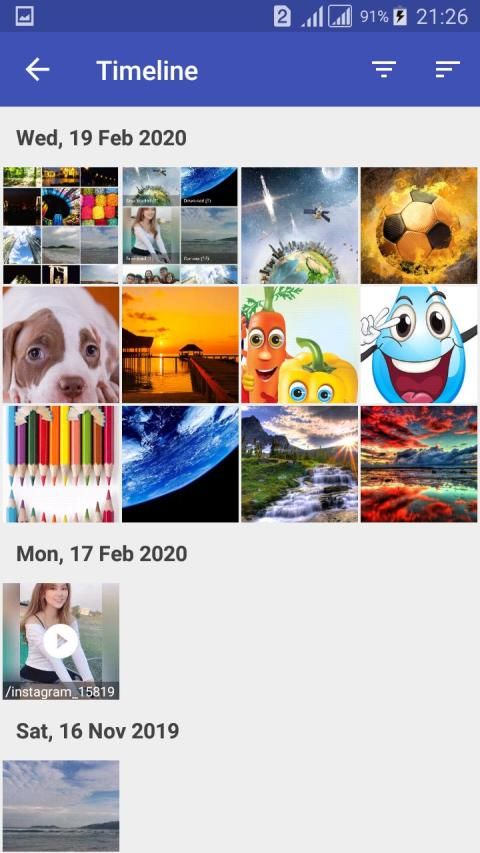 - विकल्प के आधार पर छाँटें: नाम से छाँटें, तिथि के अनुसार छाँटें, आकार वार छँटाई, आरोही / अवरोही छँटाई फोटो ग्रिड।