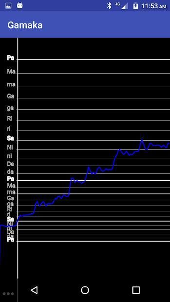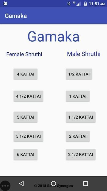 गामाका कार्नाटिक संगीत में स्वरा (नोट्स) और स्वरस्थण (टन) का पता लगाता है और गाता है क्योंकि गायन / खेल वास्तविक समय के आधार पर होता है। बाईं तरफ की स्क्रीन, नर और मादा श्रुतियों के लिए बारह स्वरस्थों के साथ दो ऑक्टोव प्रदर्शित करती है । महिला shruthis: 4, 4 1/2, 5, 5 1/2 और 6 kattais। पुरुष shruthis: 1/2, 1, 1 1/2, 2, और 2 1/2 kattais। इष्टतम प्रदर्शन: एंड्रॉइड 6.0 और ऊपर।