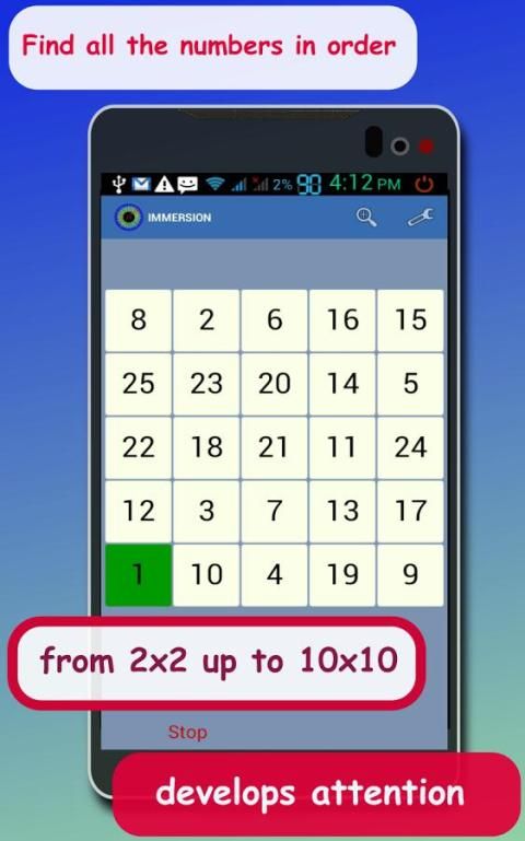 1 Schulte तालिका 10x10 को 2x2 से आकार.