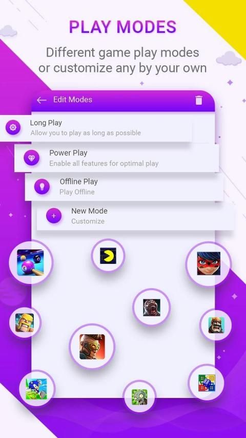 इस ऐप में "गेम मोड" भी है, जहां आप अपने गेम के लिए निर्दिष्ट फोन वातावरण लागू करना चुन सकते हैं। लांग प्ले, पावर प्ले, ऑफ़लाइन प्ले डिफ़ॉल्ट रूप से उपलब्ध है।