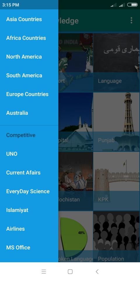 General Knowledge question & answer, UNO & International Organizations, Current Affairs, World Economy Awareness,Everyday science, World geography, Smallest and largest place of world, old and new name of cities & countries, International Airlines,Annual days and weeks,about Islam, Information of each countries about their ( independence Day,Capital,Currency,founder,Religion,province's,official language,Country code and history),Detail information about Pakistan(About Pakistan National language,sports,Religion,Province,Capital of Pakistan,Provinces of Pakistan,Punjab , sindh,KPK, Baluchistan,culture forest,River,desert,mountains,Roads,Border with international countries,Nuclear power and Northern Areas of Pakistan),Question answer of computer, English Vocabulary which Covers( form of verbs, synonyms and antonyms), detail about MS Office and All Subjects question answers.