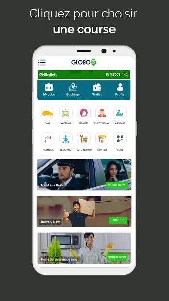 Globo est l’application qui vous permet de commander un service à domicile: Taxi, livreur, plombier, esthéticienne, coiffeur, dépanneur en quelques minutes, 24h/24, 7j/7. Plus besoin s'inquiéter, tout se passe depuis votre mobile. Un clic suffit pour commander une course. Le paiement est simple, automatique par carte ou en cash.