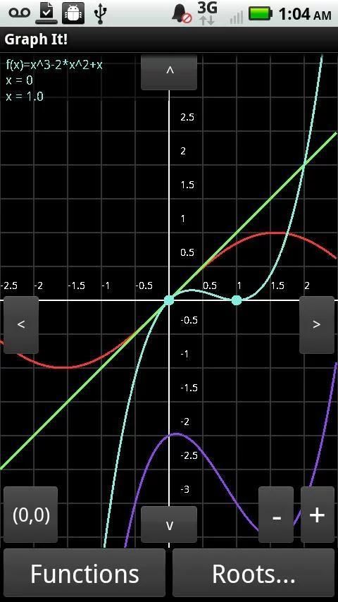 Essential graphing calculator functions: tracing, dy/dx, roots, extrema (max/mins) and intersections, all controlled by multi-touch! (See video for