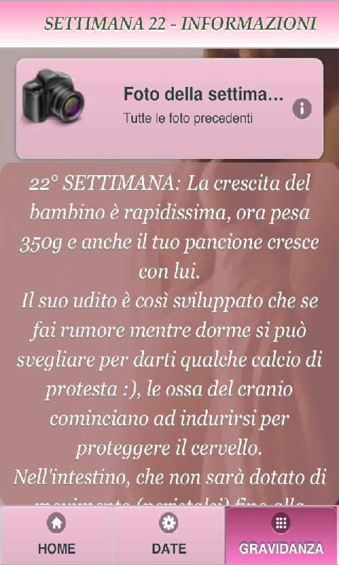 Una volta inseriti i dati come visto in precedenza, automaticamente il programma propone le informazioni in merito alla settimana di gravidanza in corso, riportando informazioni di carattere generale sullo sviluppo del bambino e sui cambiamenti che avvengono nella madre.
