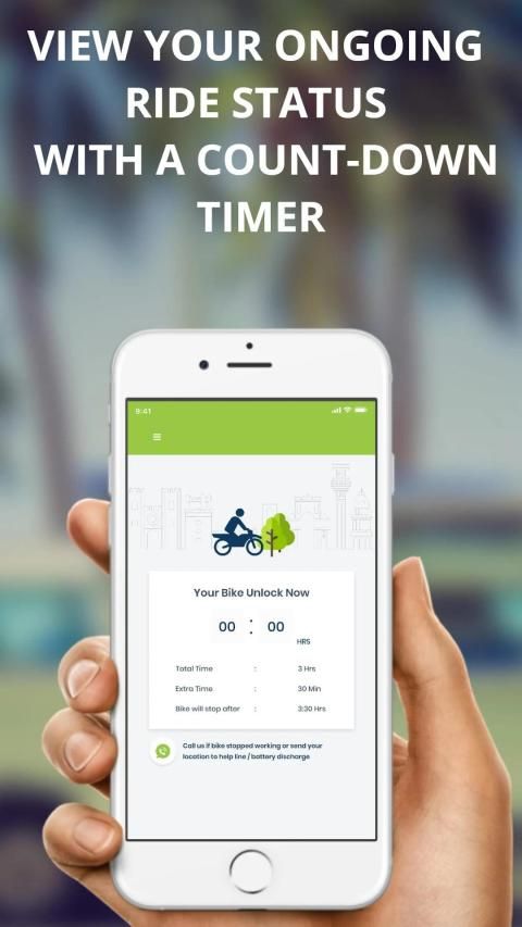 प्लाश स्क्रीन होम डीलर के स्टेशन का चयन करें एक पैकेज का चयन करें utes खरीद मिनट भुगतान पूरा करें Min बुक राइड खरीदी मिनट का उपयोग करके अनलॉक बाइक उत्पन्न क्यूआर-कोड का उपयोग करके देखें मानचित्र पर आने वाली सवारी नेविगेशन जाने कितने मिनट शेष काउंट-डाउन टाइमर राइड के दौरान किसी भी मदद के लिए कॉल सपोर्ट टीम-क्यू-कोड को फिर से स्कैन करके डीलर स्टेशन पर बाइक जमा करें देखें सवारी का इतिहास देखें दोस्तों को देखें और मिनट कमाएँ संपादित करें प्रोफ़ाइल संपादित करें