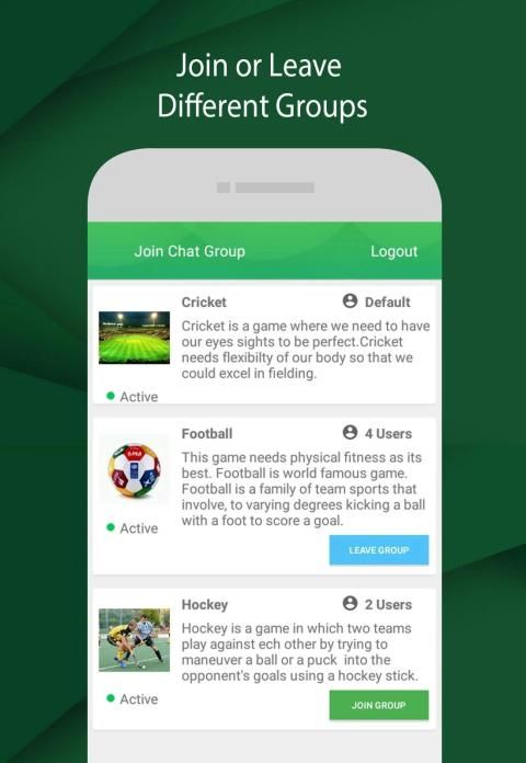 समूह चैट समुदाय विषय विशिष्ट चैट समूहों द्वारा आयोजित किया जाता है। कुछ समूह हैं जहाँ आप समान विचारधारा वाले लोगों के साथ बातचीत शुरू कर सकते हैं। प्रत्येक संदेश वर्तमान में ऑनलाइन पूरे समूह द्वारा पढ़ा जाएगा।