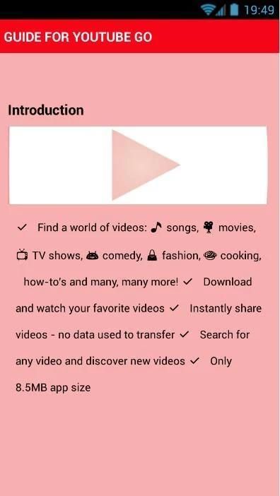 -Youtube GO आप ऑफ़लाइन यूट्यूब वीडियो देखने और अपने वाईफ़ाई या 3 जी / 4 जी इंटरनेट का उपयोग नहीं करते है!