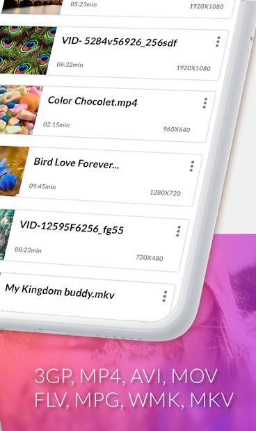वीडियो प्लेयर एवीआई, एमपी 4, डब्लूएमवी, आरएमवीबी, एमकेवी, 3 जीपी, एम 4 वी, एमओवी, टीएस, एमपीजी, एफएलवी इत्यादि सहित लगभग सभी वीडियो प्रारूपों का समर्थन करता है, बस आपके डिवाइस डिकोडर पर निर्भर करता है।