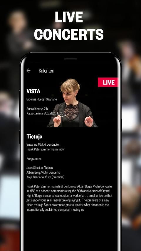 लाइव प्री-कंसर्ट बात (फिनिश में) आपको मूड में लाने में मदद करेगी। अंतराल के दौरान आप अधिक दिलचस्प लोगों से भी मिल सकते हैं और सुन सकते हैं कि पर्दे के पीछे क्या होता है। आप किसी भी समय कॉन्सर्ट रिकॉर्डिंग और साक्षात्कार में वापस आ सकते हैं।