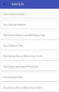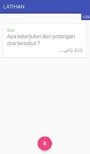 aplikasi ini menyajikan menu materi yang terdiri dari doa-doa pilihan kemudian aplikasi ini dilengkapi dengan latihan menjawab potongan doa menggunakan speech recognition yang diharapkan bisa menarik minat menghafal doa-doa