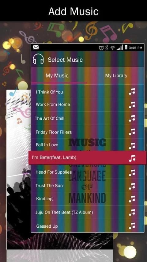 >> इस ऐप के लिए वीडियो में अपना गाना सेट करने के लिए अपनी संगीत लाइब्रेरी से संगीत जोड़ें।