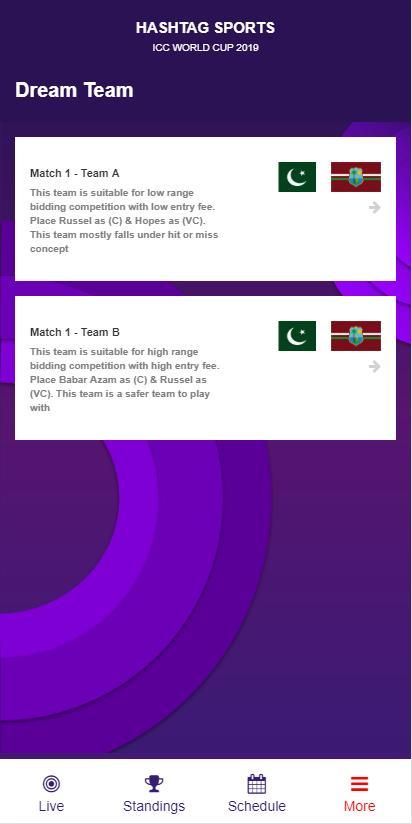 It is a sports update application. It fetches live match scores from the ongoing matches. Currently we are serving ICC Cricket World Cup 2019 Live updates with standings, stats, schedules, news from the ground to keep you updated. Also it has Dream Team Prediction which lists the best predicted team for any match