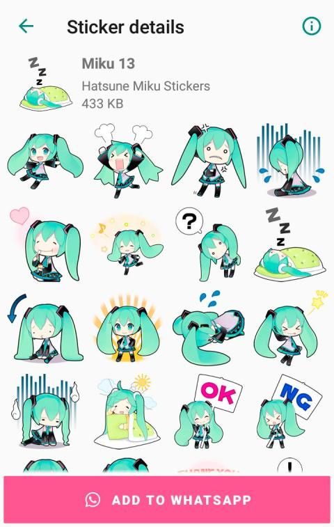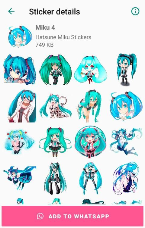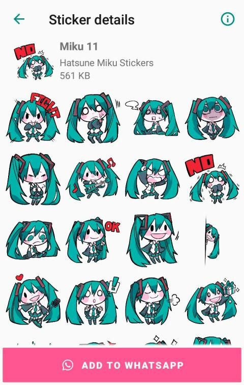 This app contains a large collection of packs of Hatsune Miku Stickers for WhatsApp. Cute Kawaii Hatsune-Miku for WhatsApp stickers collection, with many different stickers set. Now express yourself using awesome Vocaloid Hatsune-Miku Stickers with WAStickerApps.