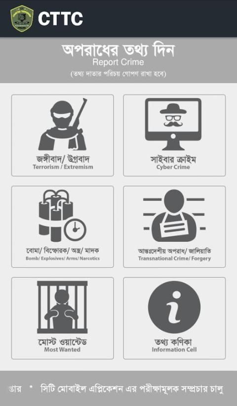 आतंकवाद और अंतर्राष्ट्रीय अपराध इकाई (सीटी) बांग्लादेश पुलिस की ढाका मेट्रोपोलिटन पुलिस के एक नव उद्घाटन किया विशेष इकाई है। आतंकवाद, उग्रवाद, साइबर अपराध, अंतर्राष्ट्रीय अपराध, बम / विस्फोटक / हथियार और आतंकवाद का मुकाबला करने के अन्य मानदंडों के खिलाफ बहुत शुरुआत इकाई शुरू कर दिया है बेताब गतिविधियों से। इकाई नागरिक, अप्रवासी भारतीय और लोग हैं, जो खुफिया प्रदान करना चाहते हैं या संवाद / एक कदम आतंकवादियों की तुलना में आगे रहने के लिए मजबूर सहयोग करना चाहते हैं के सभी क्षेत्रों के लिए एक सरकारी मोबाइल आवेदन शुरू किया है। अपने सेल फोन पर वह मोबाइल आवेदन डाउनलोड और अपने विचार / सूचना / राय सीटी कर सकते हैं।