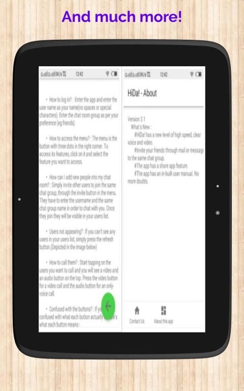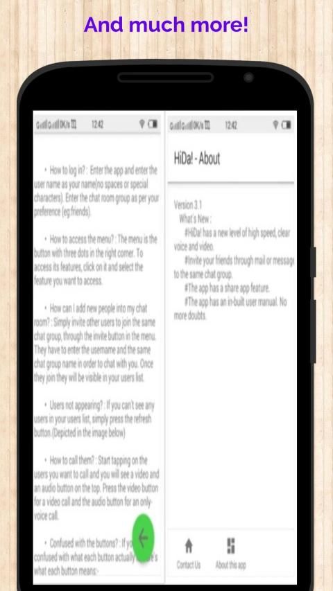• A GREAT FEATURE - THE SCREEN SHARE : HiDa! isn't meant to be some boring conferencing app. It's awesome Screen Share feature allows users to share the activities on their screen. So you can share a PPT live through this app or conduct virtual board meetings from anywhere or conduct virtual classrooms! So HiDa! is a multi-purpose conferencing app.