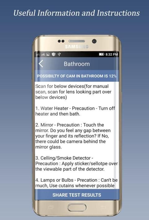 का पता लगाने हिडन कैमरा विकिरण मीटर विकल्प का उपयोग अपने छिपे हुए जासूस कैमरा डिटेक्टर में और इस तरह के दर्पण के पीछे या में संदिग्ध के रूप में क्षेत्र के पास अपने फोन को स्थानांतरित इलेक्ट्रॉनिक दीपक और एक त्वरित स्कैन करने के लिए। विकिरण काफी अधिक हैं, तो विकिरण मीटर आप आंकड़ा दिखा देंगे और यह भी beeping है कि वहाँ कुछ पता चला है कि यह एक छिपे हुए जासूस कैमरा हो सकता है शुरू करने से आपको सूचित करेंगे।