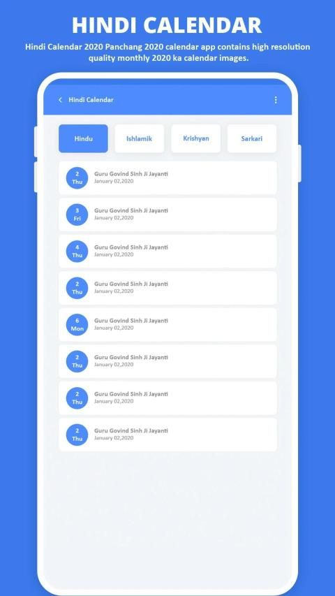 Hindi Calendar 2020 app help to get the auspicious days for the year 2020 calendar. Like as Giraha pravesh muhurat, Giraha aramv muhurat, Vahan muhurat, Mundan muhurat, Subha muhurat, Nama Karana muhurat for 2020 calendar year