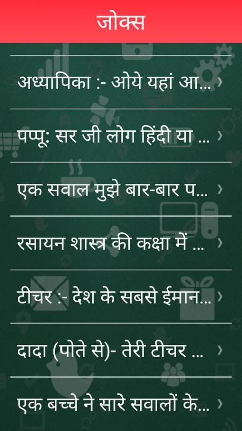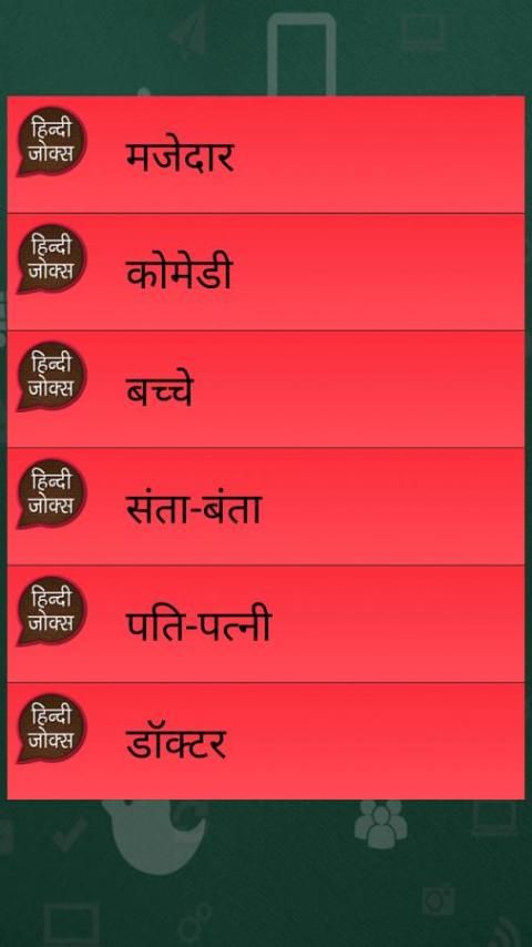 लीजिए और हिंदी चुटकुले कि बाजार में नए हैं हिस्सा है। यह हिन्दी चुटकुले एप्लिकेशन पिता और पुत्र, पति और पत्नी और बंता के चुटकुले से भरा है।